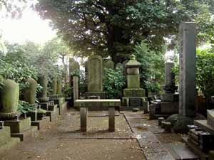 天王寺墓地。木々に囲まれている。